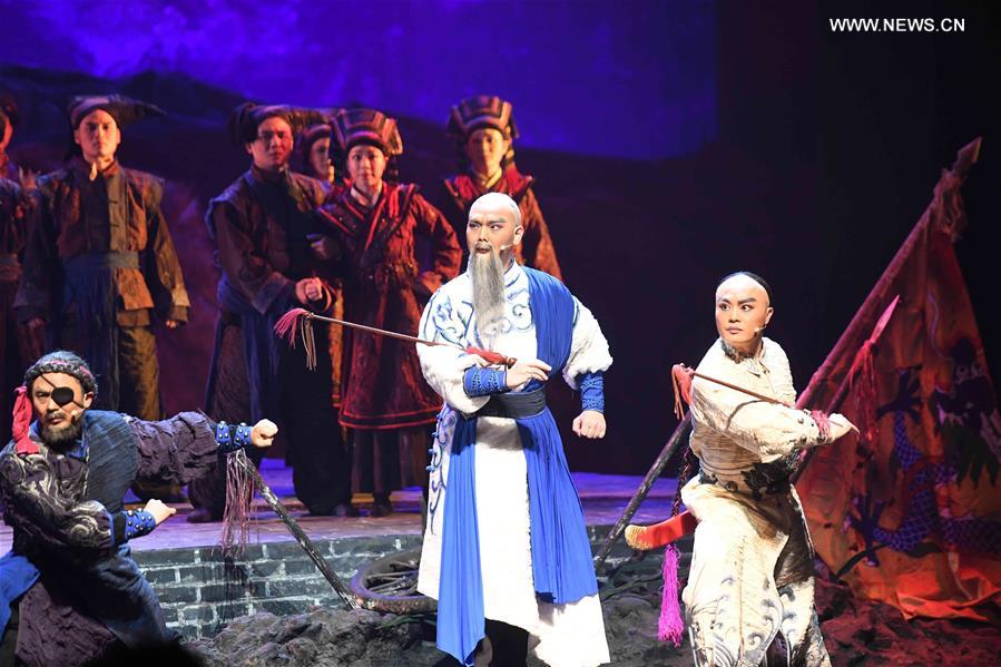 Troupers perform during the Zhuang ethnic Drama "Feng Zicai" in Beijing, capital of China, Sept. 9, 2016. The drama eulogizes the Chinese hero Feng Zicai leading his force defending against the invading French army during China's Qing Dynasty (1644-1911). (Xinhua/Chen Yehua)