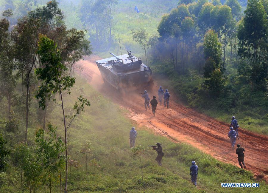 Chinese and Russian marines take part in a joint naval drill in Zhanjiang, south China's Guangdong Province, Sept. 14, 2016. China and Russia started "Joint Sea 2016" drill off Guangdong Province in the South China Sea on Tuesday. The drill will run until Sept. 19, featuring navy surface ships, submarines, fixed-wing aircraft, helicopters, marines and amphibious armored equipment. (Xinhua/Zha Chunming)