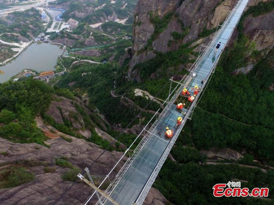 Chinese workers replace a scratched piece of glass with a new one on the glass-bottomed suspension bridge 180 meters above the ground at the Shiniuzhai National Geopark in Pingjiang county, Yueyang city, Central China's Hunan province, September 19, 2016.(Photo: China News Service/Yang Huafeng)