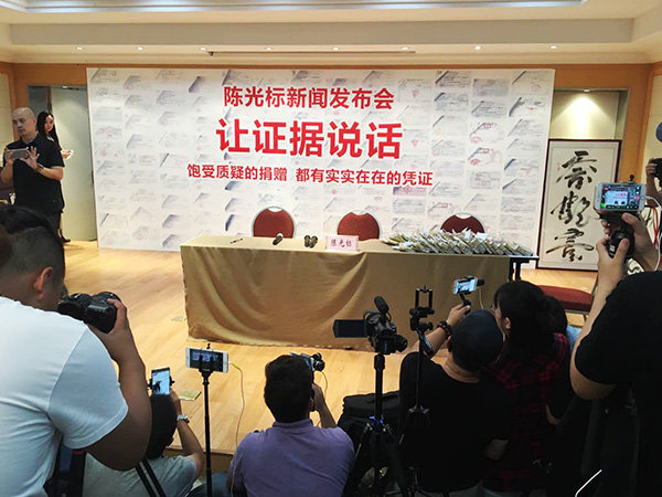 At the press conference, Chen Guangbiao presented the invoice and related documents for his donation, but reporters were not able to examine the files.