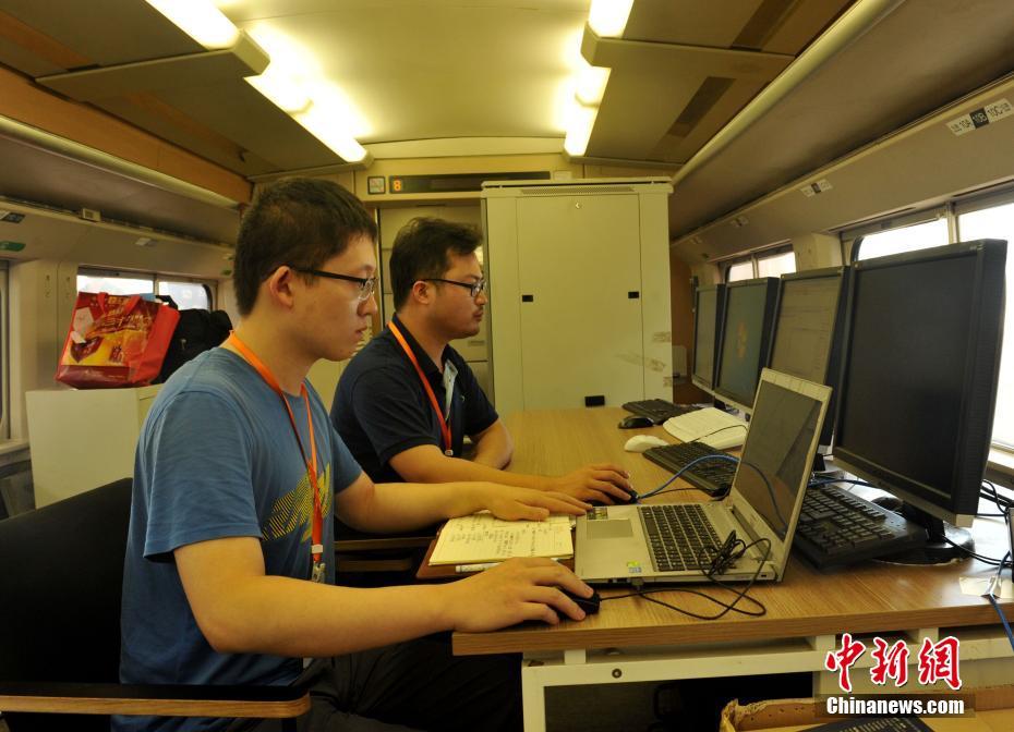 Technicians monitor a bullet train's test run on a section of an international railway connecting China to Vietnam and Laos. This section of railway is expected to open at the end of this year.[Photo: Chinanews.com]