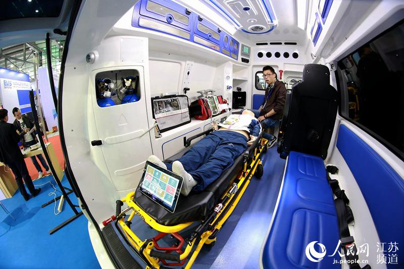 Although its appearance is similar to those of normal ambulances, the special ambulance on display at the exhibit allows first-aid workers to calculate patients’ vital signs and send the information ahead to the hospital. This way, doctors can create a treatment plan even before an emergency patient’s arrival.