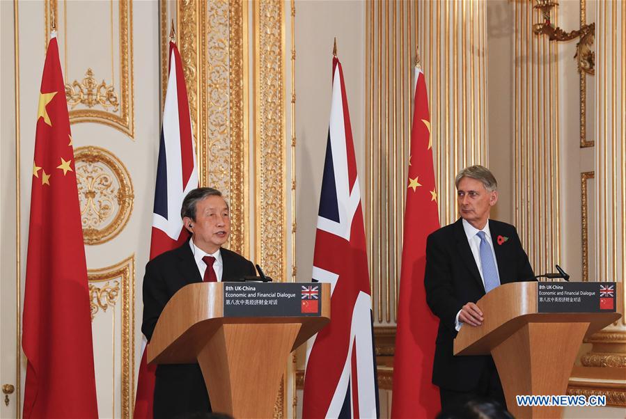 Chinese Vice Premier Ma Kai (L) holds a joint press conference with British Chancellor of the Exchequer Philip Hammond after the eighth China-Britain Economic and Financial Dialogue in London, Nov. 10, 2016. (Xinhua/Han Yan)