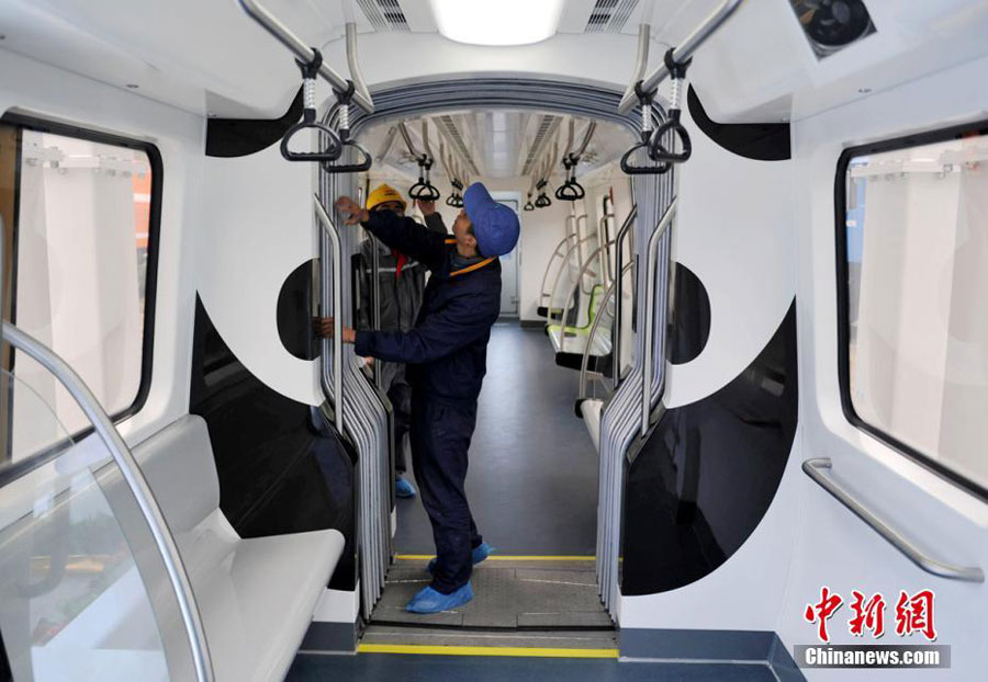 China’s first unmanned, panda-shaped “Sky Train” rolled off the production line in Ziyang, southwest China’s Sichuan Province on December 8, 2016. The renewable-energy unmanned suspension railway is battery-powered, with cute pandas painted through carriages. The unmanned train can carry a maximum of 144 passengers as it hangs and zips along the monorail track at speeds of up to 65 km/h. [Photo: Chinanews.com]
