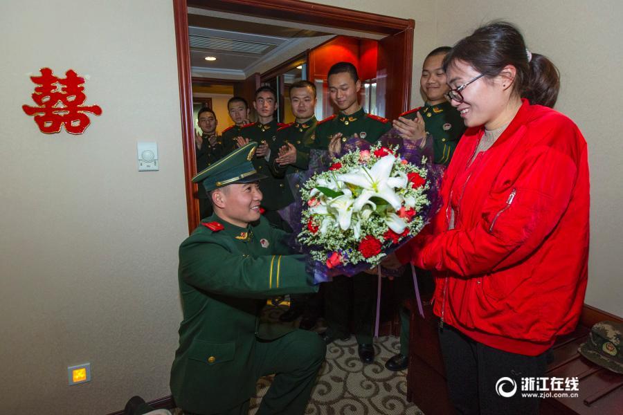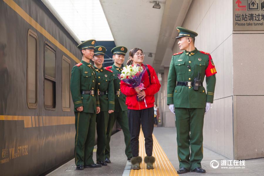 An armed police officer named Zhang Qinghua and his fiancee, Huang Mengjiao, enjoyed a special wedding ceremony on the platform of Hangzhou Railway Station on Jan. 22. The couple's wedding was originally scheduled for Jan. 23. However, Zhang decided to postpone the event since he had been deployed to the station for a security mission during Spring Festival. In order to give Zhang a happy surprise, Huang came to Hangzhou on Jan. 22 and organized a simple wedding ceremony. The marriage was witnessed by Zhang's comrades-in-arms.