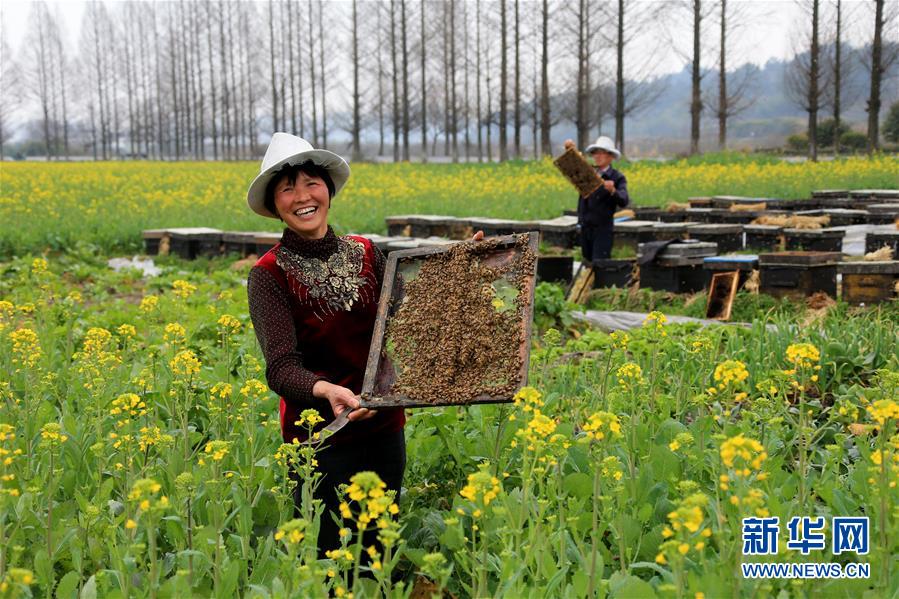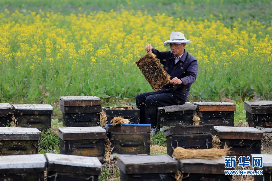 Beekeepers gather honey in a rape flower field in Huizhou, Anhui province. The flowers are currently in full bloom around Anhui, the Xinhua News Agency reported on Feb. 20.