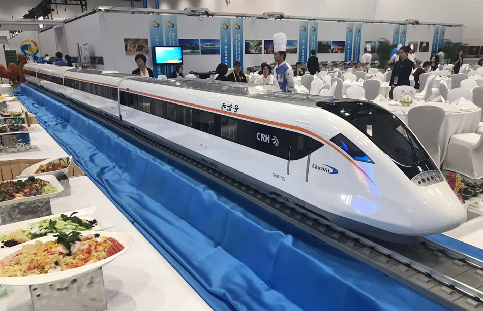 Photo taken on May 12 shows a model high-speed train on display at the cafeteria in the media center for the upcoming Belt and Road Forum for International Cooperation. The media center offers free meals, fruits, coffee, tea, and desserts for journalists. (People’s Daily Online/Wang Yuran)