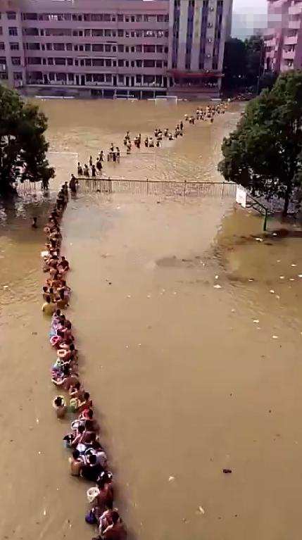 Students from Xiangxiang No. 1 Middle School waded in floodwater toward safe zones on Sunday, July 2. Floodwaters entered the school’s dormitory building at 10 a.m. on Saturday and rose waist high by 6 a.m. the next day. The school told students to evacuate the building and requested assistance from the local government, which dispatched boats to assist in the evacuation. As of Sunday, 11:30 a.m., 1,300 students had reached safe zones. (Photo/Xiaoxiang Morning Post)