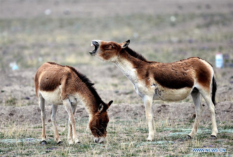 Photo taken on June 30, 2017 shows Tibetan wild donkeys in Hoh Xil of northwest China's Qinghai Province. The 41th session of the World Heritage Committee on July 7, 2017 decided to put China's Qinghai Hoh Xil on the prestigious World Heritage List as a natural site. So far, China has 51 sites inscribed to the List. (Xinhua/Wang Bo)