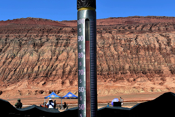 A huge thermometer shows surface temperatures hit 88 C in Turpan, Xinjiang Uygur autonomous region, on Sunday. LIU JIAN/CHINA DAILY