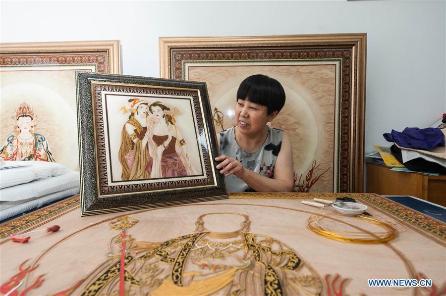 Inheritor of the golden wire color ceramic glaze art Wang Yuping presents her artwork in Shijiazhuang, capital of north China's Hebei Province, July 18, 2017.(Xinhua/Pu Dongfeng)