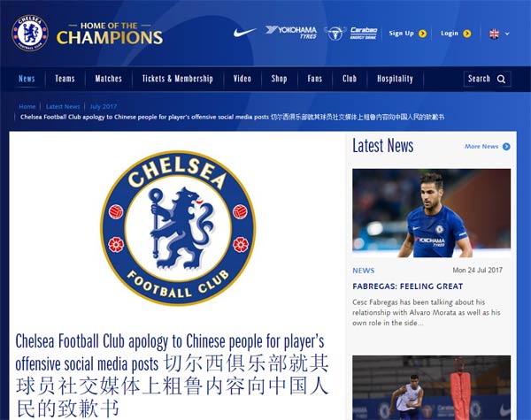 Though winning a 3-0 victory at a preseason match against Arsenal in Beijing, Chelsea did not leave China in a cheerful mood after having to apologize to the Chinese people for a winger who was suspected of insulting the host country of their winning match.