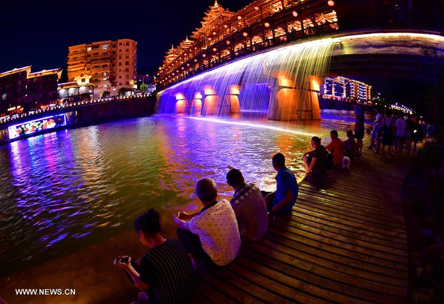 People enjoy coolness and the beautiful night view illuminated with colored lights along the Fengyu bridge at Xuanen County in Enshi Tujia and Miao Autonomous Prefecture, central China's Hubei Province, July 23, 2017. (Xinhua/Song Wen)