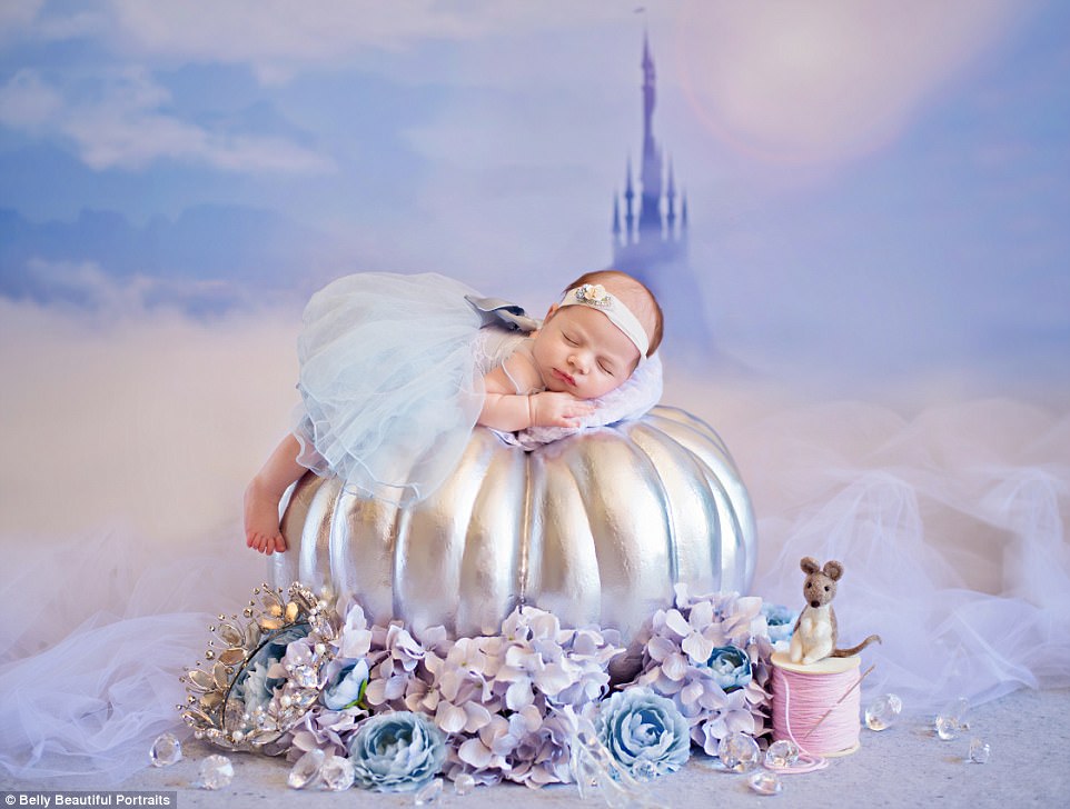 She also did more elaborate shoots with each of the babies on their own. Baby Cinderella is pictured in a blue tutu, sleeping soundly on top of a decorative silver pumpkin.