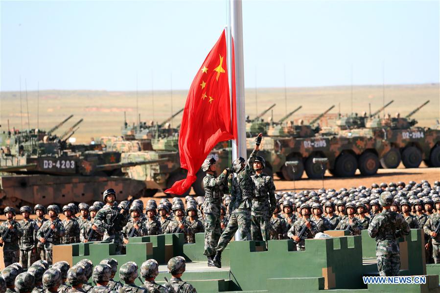 A flag-raising ceremony is held during a military parade celebrating the 90th anniversary of the founding of the Chinese People's Liberation Army (PLA) at Zhurihe training base in north China's Inner Mongolia Autonomous Region, July 30, 2017. Chinese President Xi Jinping, also general secretary of the Communist Party of China Central Committee and chairman of the Central Military Commission, will inspect the troops and deliver an important speech. (Xinhua/Li Gang)