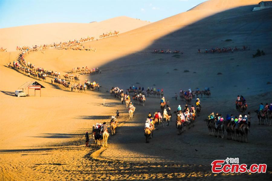 Tourists ride camels at the Crescent Spring and Singing-Sand Dunes scenic spot in Dunhuang City, Northwest China’s Gansu Province. More than 25,000 people visit the tourist attraction each day during the peak summer period. (Photo: China News Service/Wang Binyin)