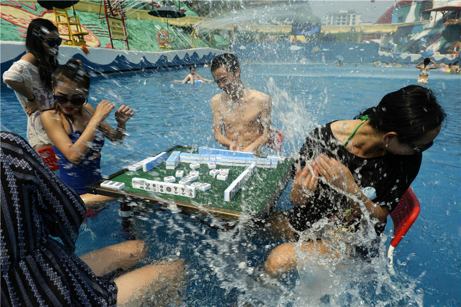 People have fun with water fight and playing mahjong in a swimming pool, in Southwest China's Chongqing, August 2, 2017. [Photo by Ran Wen/Asianewsphoto]