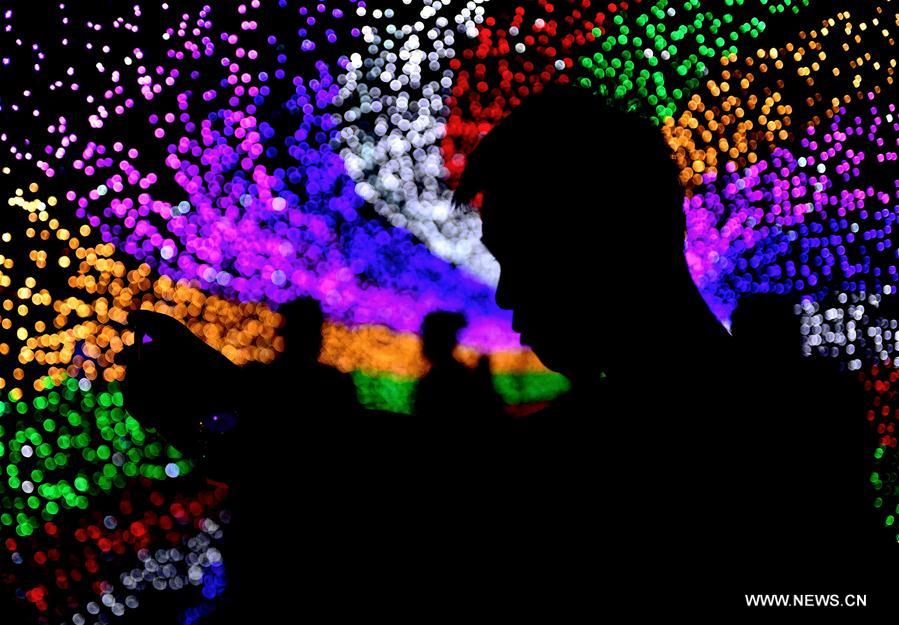 Tourists are silhouetted against the light that illuminates a park in Gu'an County of north China's Hebei Province Aug. 10, 2017. The county is hosting a light festival to attract tourists. (Xinhua/Wang Xiao)