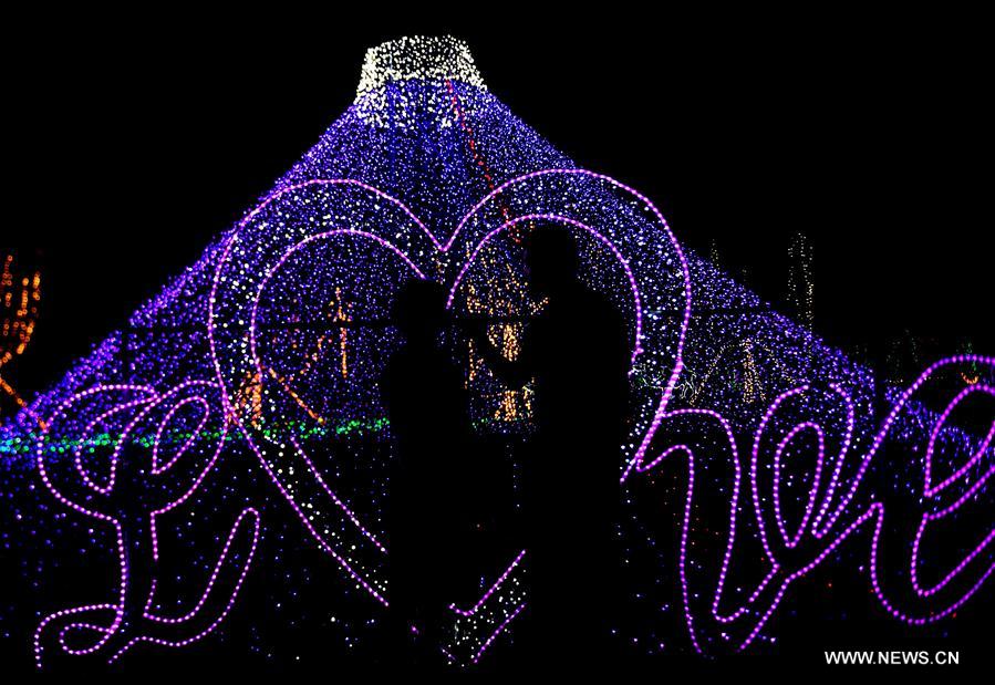 Tourists are silhouetted against the light that illuminates a park in Gu'an County of north China's Hebei Province Aug. 10, 2017. The county is hosting a light festival to attract tourists. (Xinhua/Wang Xiao)