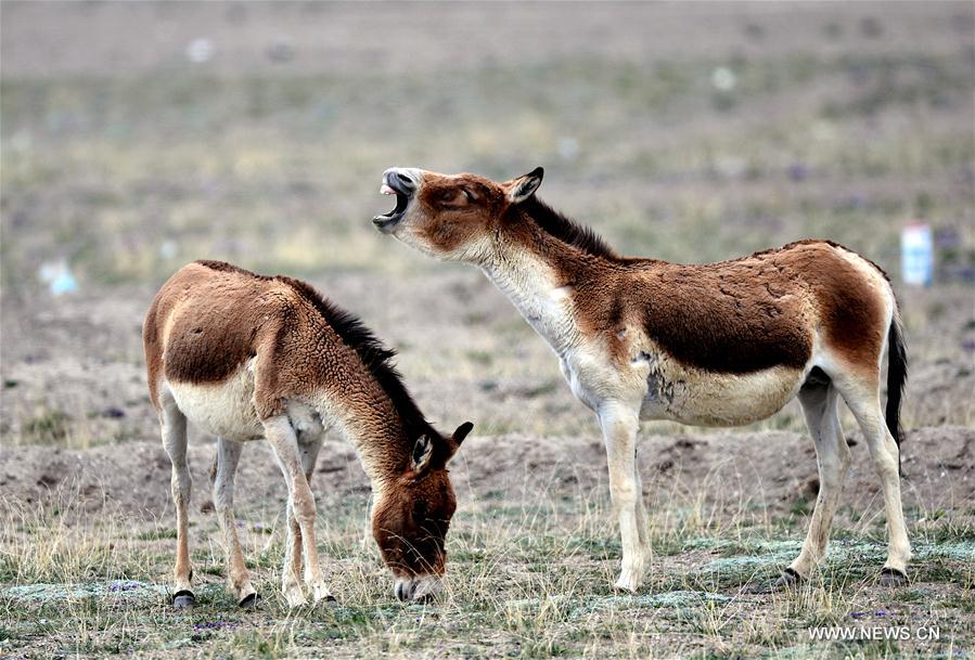 Two kiangs are seen in Hoh Xil in Yushu Tibetan Autonomous Prefecture, northwest China's Qinghai Province, June 30, 2017. Hol Xil has an average altitude of over 4,600 meters, making it an ideal habitat for Tibetan antelopes, kiangs and other animals. It was enlisted as one of the UNESCO's World Natural Heritages in July 2017. (Xinhua/Wang Bo)