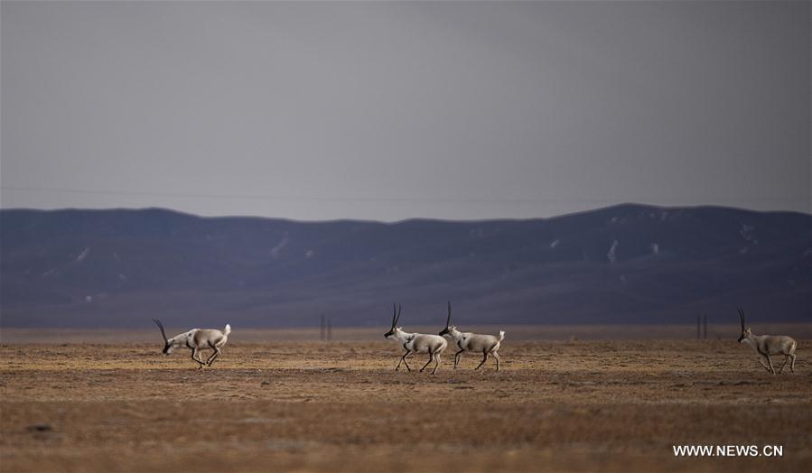 Tibetan antelopes are seen in Hoh Xil in Yushu Tibetan Autonomous Prefecture, northwest China's Qinghai Province, Dec. 2, 2016. Hol Xil has an average altitude of over 4,600 meters, making it an ideal habitat for Tibetan antelopes, kiangs and other animals. It was enlisted as one of the UNESCO's World Natural Heritages in July 2017. (Xinhua/Wu Gang)