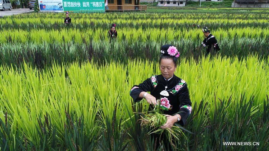 Farmers of Miao ethnic group work in paddy-fields in Yangfang Village of Taijiang County, southwest China's Guizhou Province, Aug. 24, 2017. (Xinhua/Yang Ying)