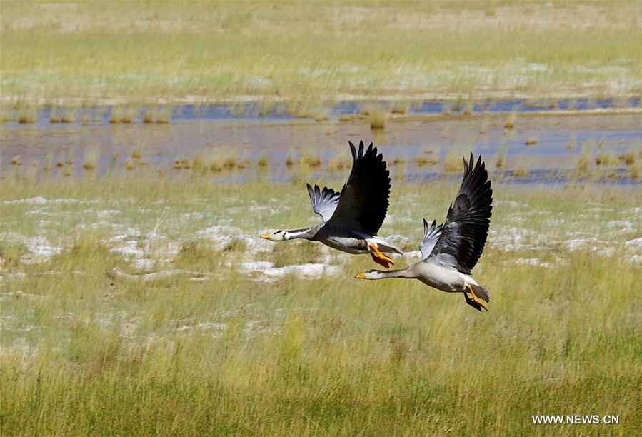 Spotted geese are seen flying over a marshland in Ali of southwest China's Tibet Autonomous Region, Aug. 25, 2017. Ali, an almost virgin land on the Qinghai-Tibet plateau, is home for large variety of wild animals. (Xinhua/Liu Dongjun)