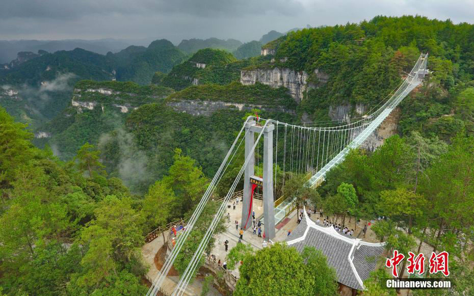 Aerial view of a skywalk made of glass at world heritage site Yuntaishan, southwest China's Guizhou Province, on August 28, 2017. The bridge is 190 meters long and 120 meters high, and opened to the public on Monday. [Photo: Chinanews.com]