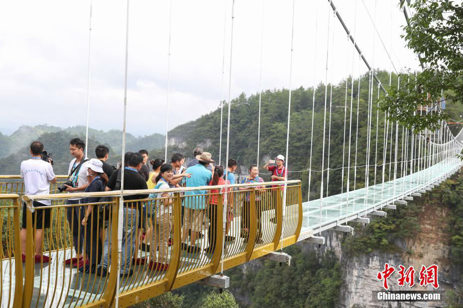 Tourists walk along a skywalk made of glass at world heritage site Yuntaishan, southwest China's Guizhou Province, on August 28, 2017. The bridge is 190 meters long and 120 meters high, and opened to the public on Monday. [Photo: Chinanews.com]