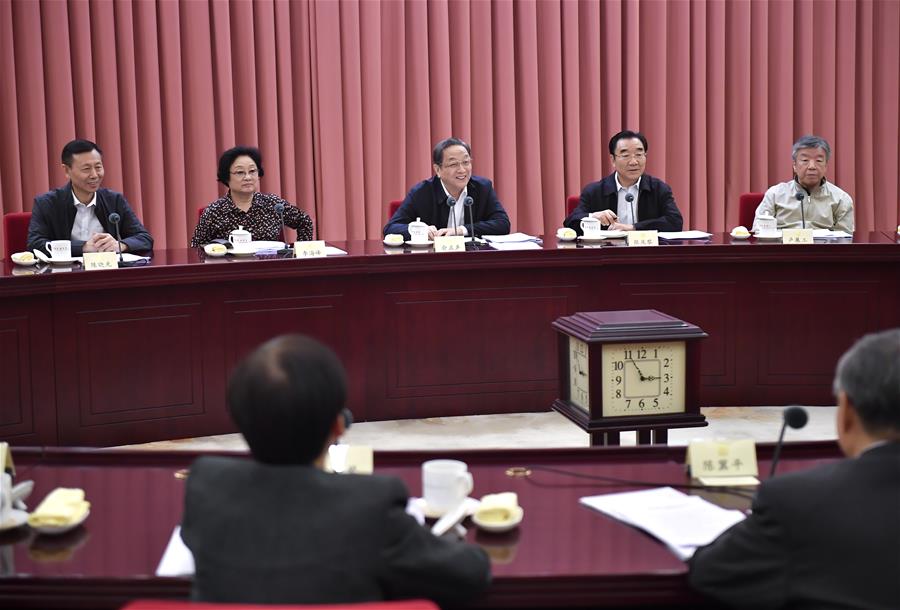 Yu Zhengsheng, chairman of the National Committee of the Chinese People's Political Consultative Conference, presides over a bi-weekly consultation session in Beijing, capital of China, Sept. 21, 2017. China's political advisors on Thursday called for creating a sound cyber environment at the session. (Xinhua/Yan Yan)