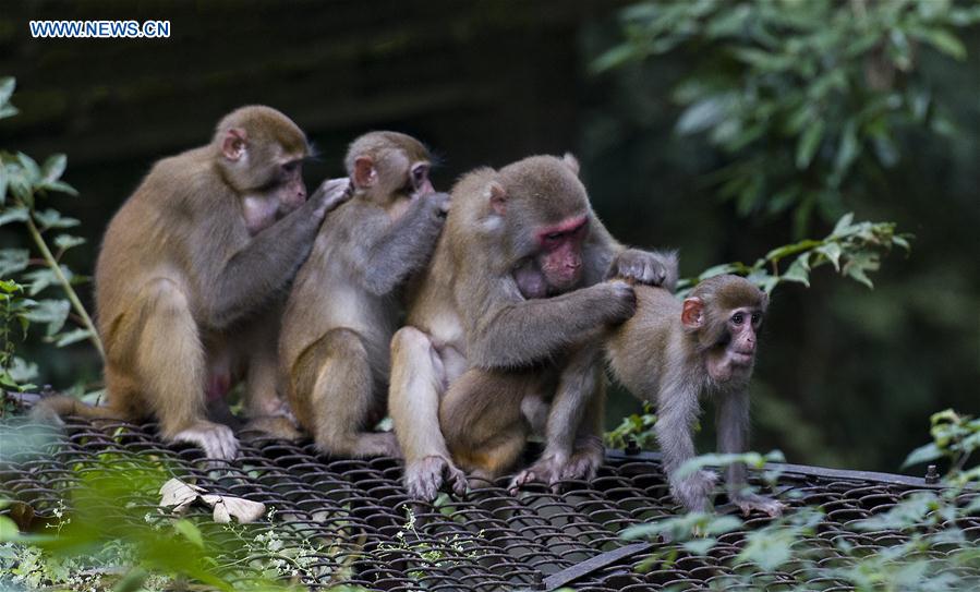 Wild rhesus macaques are seen at the Guanshan nature reserve in east China's Jiangxi Province, Oct. 1, 2017. Thanks to years of protection work, currently the nature reserve is home to more than 600 wild rhesus macaques. (Xinhua/Hu Dunhuang)