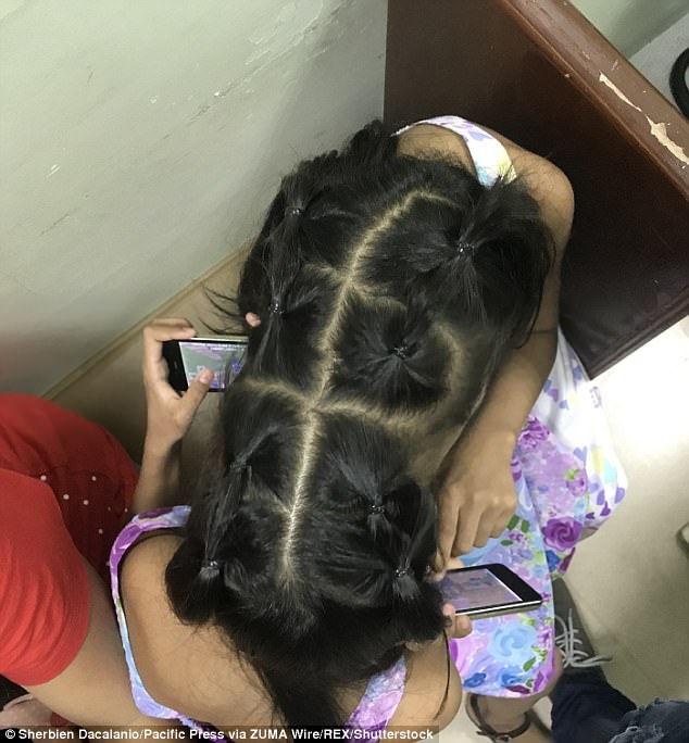 It looks like the girls, 10, have passed the time waiting for medical attention by platting their hair together. (Photo from Mail Online)