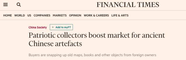 The Financial Times said that patriotic Chinese collectors boost the market for ancient Chinese artifacts.