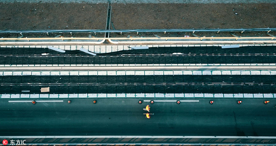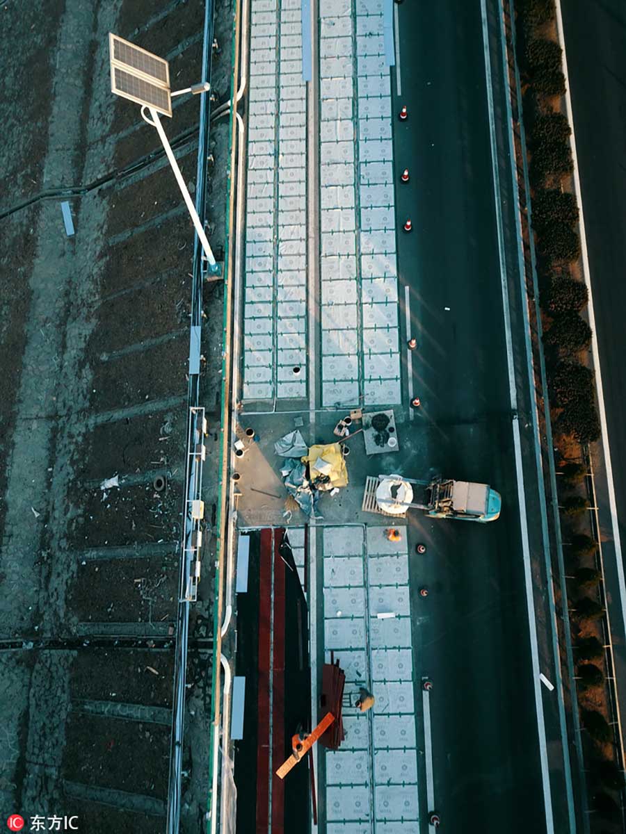 In the southern section of Jinan’s urban beltway, workers paved the photovoltaic road and placed solar power batteries under the white grids on Dec 13.