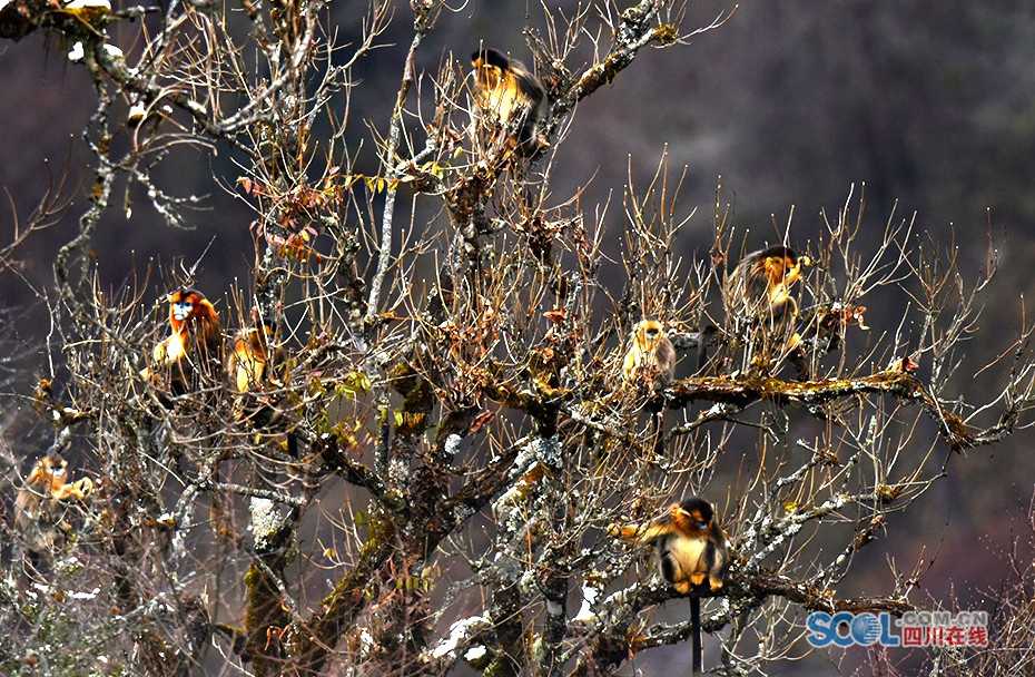 Golden snub-nosed monkeys were spotted on Tuesday looking for food and playing on trees some 100 meters from a village in Baoxing County, Ya’an City, southwest China’s Sichuan province. The monkeys left their mountain habitat to look for food after heavy snow.