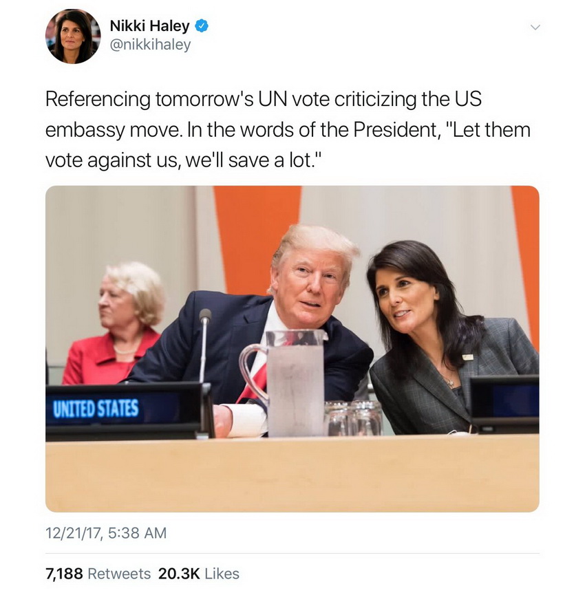 The American ambassador, Nikki Haley, issued a direct threat, saying that the countries who vote in favor of the resolution would be punished, a move which even former CIA Director John Brennan slammed as “beyond outrageous.”