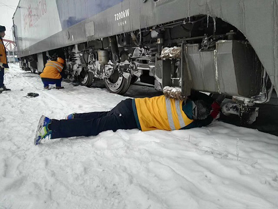 As heavy snowfall hit many parts of central and eastern China on January 4, workers at Luoyang Locomotive Depot of China Railway's Zhengzhou Group wrapped sandpipes with plastic bags to avoid freezing.