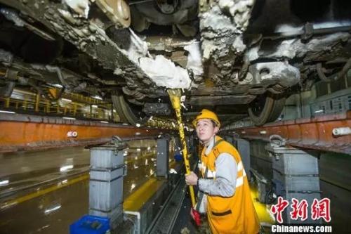 Employees with the Xi’an Railway Bureau removed snow on the tracks to ensure safe operations.