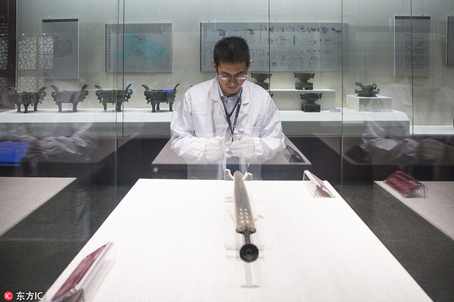 Jiang Xudong, deputy director of the Culture and History Center of the Hubei Provincial Museum, carefully studies an ancient sword that was once used by King Goujian of the State of Yue during the Spring and Autumn Period (770 B.C.- 476 B.C.). Jiang is now leading a group of scientists to explore the history of the ancient sword. Its history was vividly displayed to the public in a popular TV program called “National Treasure,” which was first aired by China Central Television (CCTV) on Dec. 3.