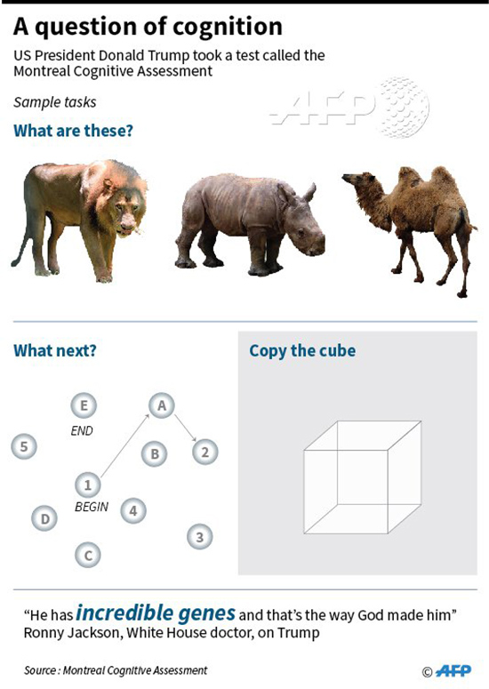 US President Donald Trump took a cognitive test recently and his doctor claimed that Trump has “incredible genes,” according to a Twitter posted by the AFP news agency on Monday.