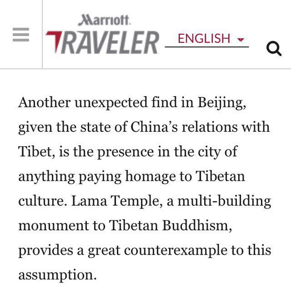 In one post titled “How to Plan a Day of Breathtaking Beauty in Beijing,” Marriott Traveler tells its readers that (surprise, surprise) you can find Tibetan culture even in a place like Beijing which, according to the Marriott publication, apparently has bad “relations with” Tibet.