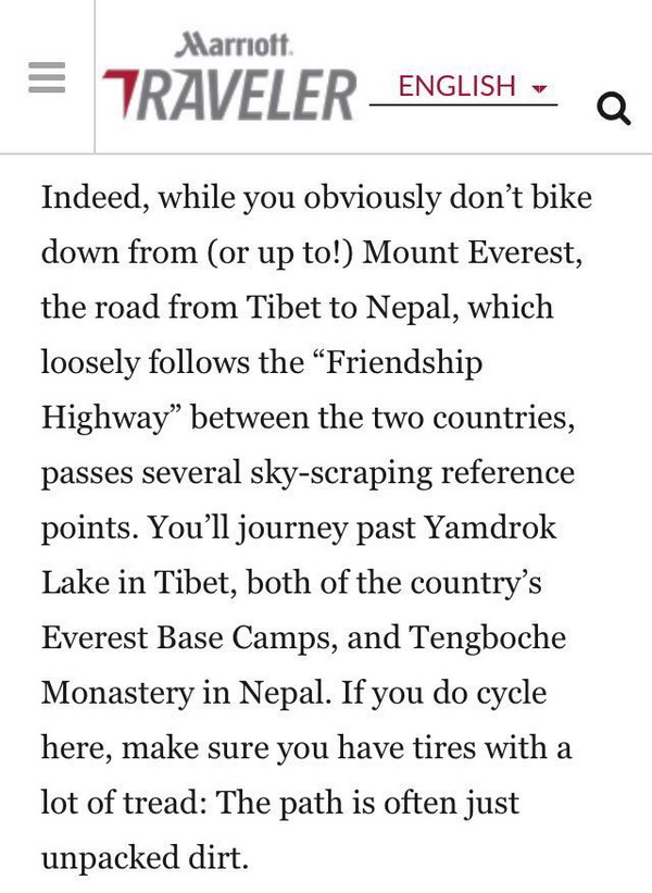 Marriott Traveler, a travel and lifestyle publication launched by Marriott International to “provide consumers with more meaningful travel destination content and information” still suggest that Tibet is a separate country.