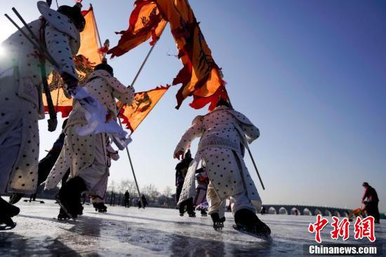 Performers in different colors skate on ice in Summer Palace/ Du Yang from Chinanews.com