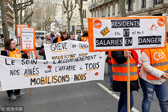 Paris (People's Daily) - Nursing home workers in France rallied today across the country, citing a lack of funding and poor working conditions, among many other concerns, as the quality of elderly care continues to crumble.