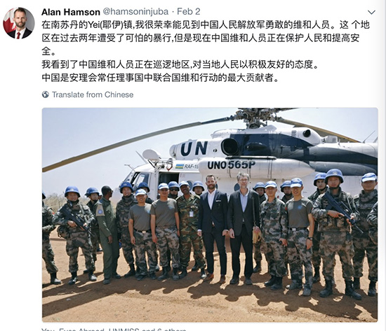 "It has been my pleasure to have met these brave Chinese peacekeepers in the town of Yei in South Sudan. This region has been tormented by horrid violence in the past two years, but its people are now protected by Chinese peacekeepers. I saw them patrol the areas and they were all friendly toward local people. Among the permanent members of the UN Security Council, China is the biggest contributor to the UN peace keeping mission," Hamson wrote in Chinese on Twitter.