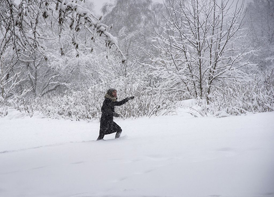 People walk next to a fallen branch due to heavy snowfall on a tree in the Botanical Garden in Moscow, Russia, Sunday, Feb. 4, 2018. (Photos: AP)