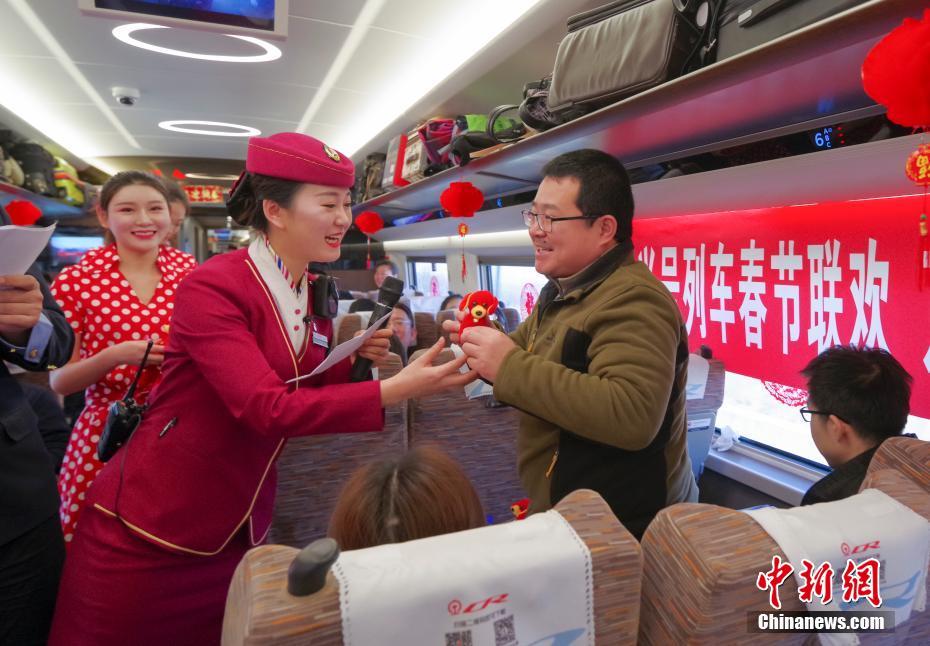 A party was held on Fuxing high-speed train heading to Shanghai from Beijing on Feb. 13 to celebrate the upcoming Chinese New Year. It was the maiden run for Fuxing locomotives in the annual Spring Festival travel rush.
