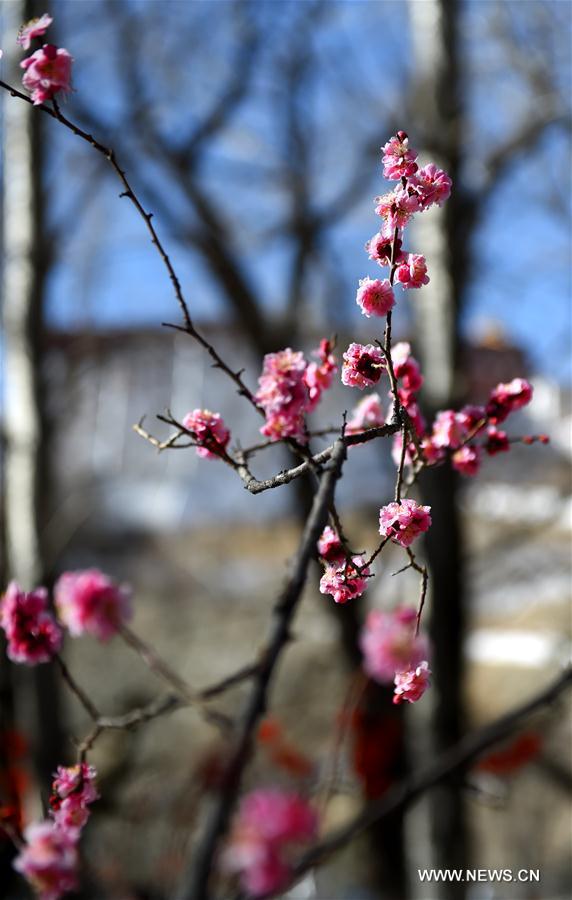 Flowers are seen in Lhasa, capital of southwest China's Tibet Autonomous Region, March 4, 2018, as the weather warms up recently. (Xinhua/Chogo)