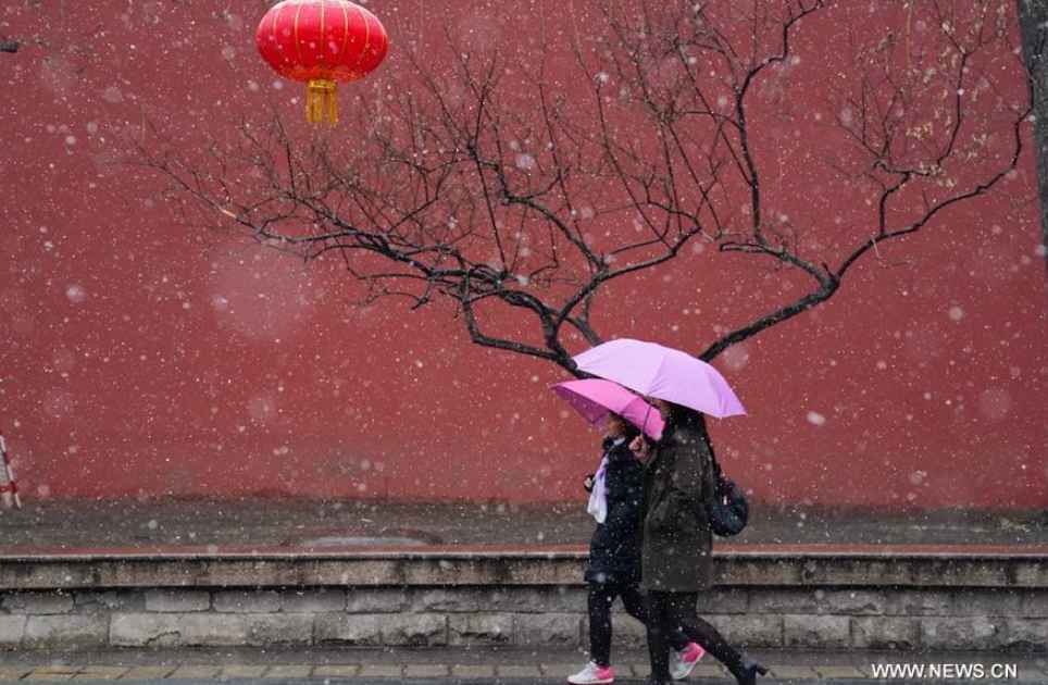 People walk in snow on Jingshan West Street in Beijing, capital of China, March 17, 2018. Snowfall hit Beijing on Saturday. (Xinhua/Zhang Cheng)