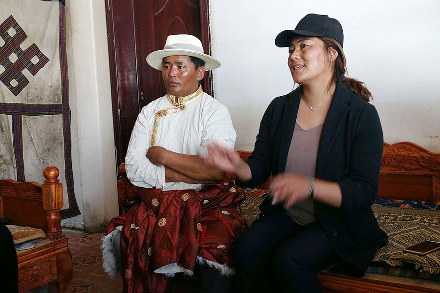 A relocated herdsman (left) lives in Caiqutang village at Damshung county, Lhasa, Tibet autonomous region, June 24, 2018. Before the herdsman moved to new home, his family's income from stocking yaks was 40,000 yuan per year. Because he suffers from rheumatism, his family was trapped in poverty. Now, the family is seeing better times after relocating. The man and his son work at the set's breeding farm, and also stock yaks at their own farm. The family's income has doubled. [Photo/chinadaily.com.cn by Zhang Jie]